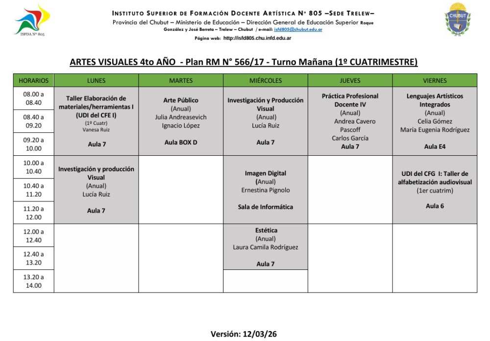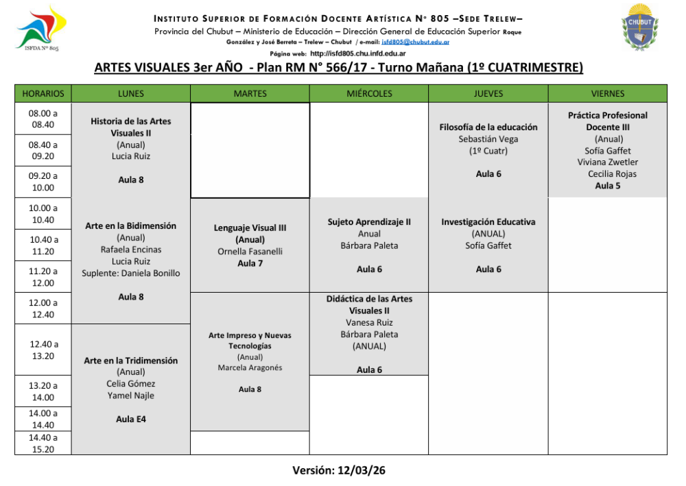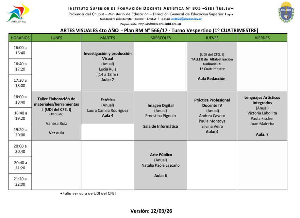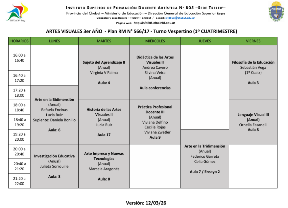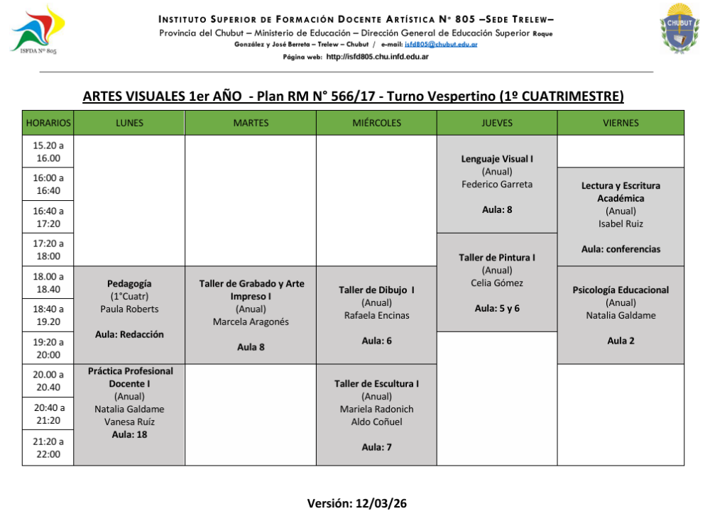 Sede Trelew- Horarios Ciclo Lectivo 2026 1er Cuatrimestre Turno Matutino Descargar Horarios Turno Matutino – Ver. 12/03/2026 Turno Vespertino Descargar Horarios Turno Vespertino – Ver. 12/03/2026