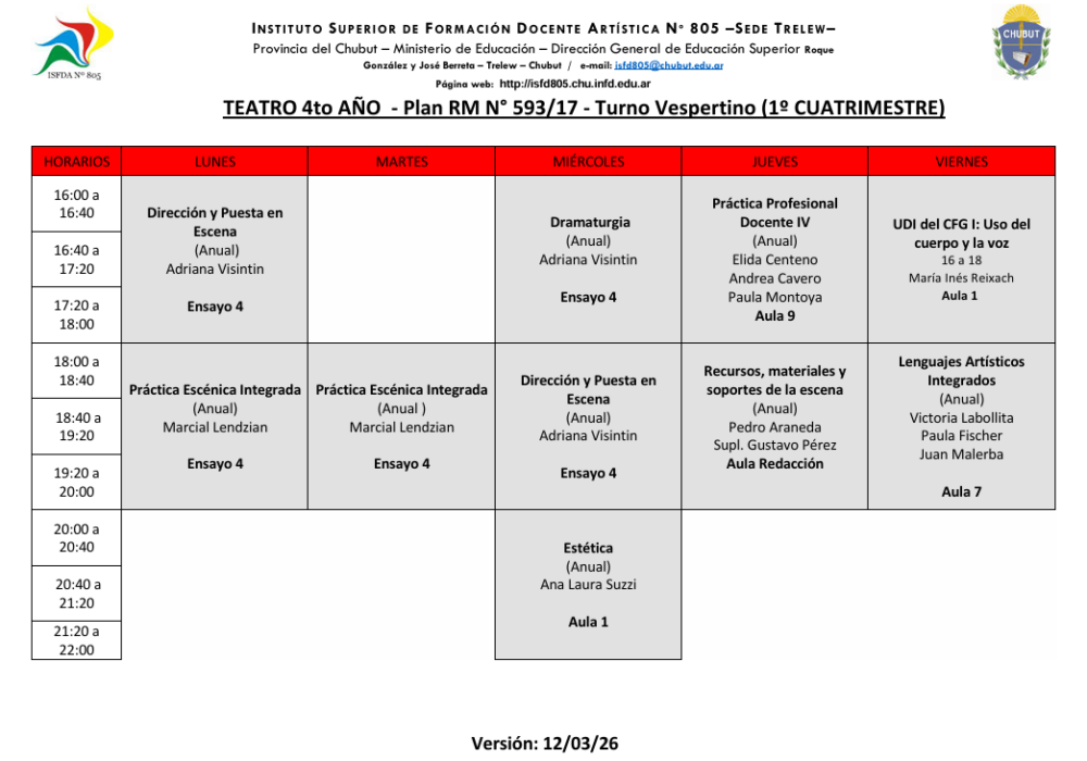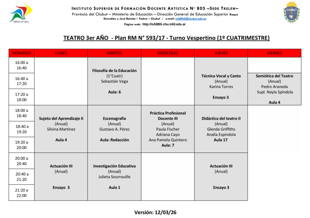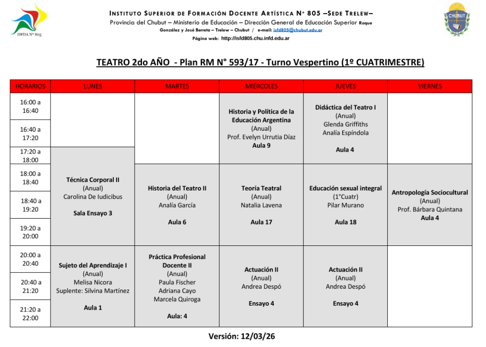 Sede Trelew- Horarios Ciclo Lectivo 2026 1er Cuatrimestre Descargar Horarios Turno Vespertino – Ver . 12/03/2026
